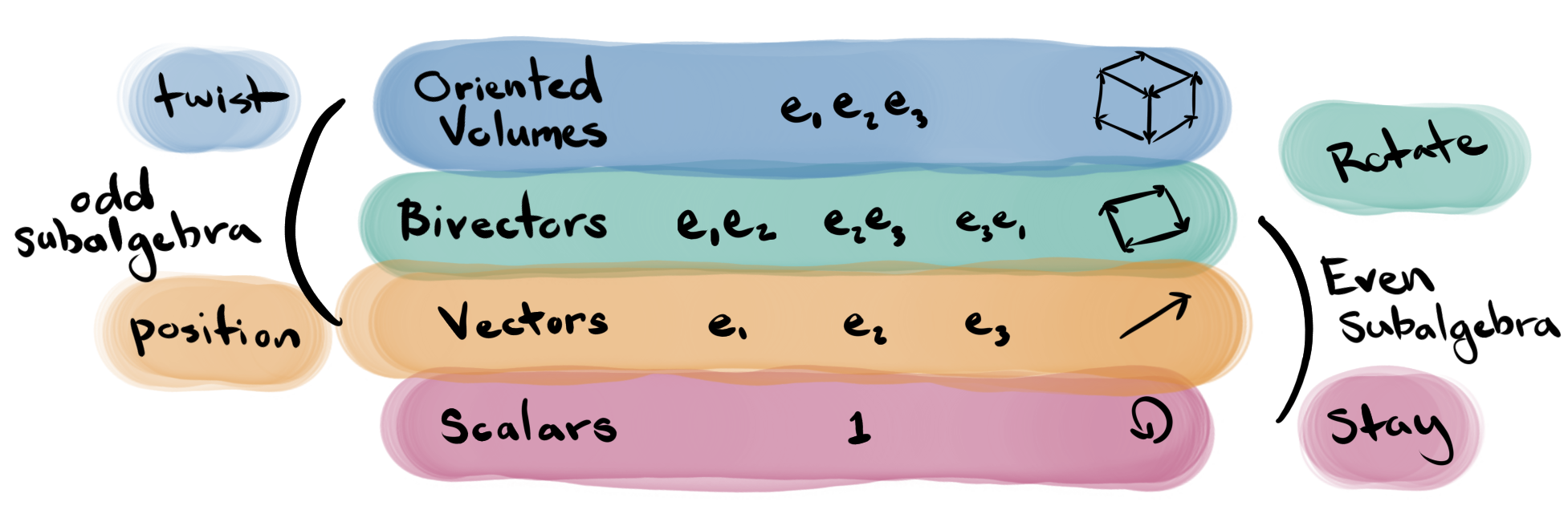 Lets finish with a brief consideration of what's called the Clifford or geometric algebras, which address these issues and more. These take as a starting point that multiplying a unit vector by itself should give back the identity, , rather than , while at the same time keeping the anti-commutative machinery necessary to permit rotations. But didn't we say this was impossible, and that the corresponding algebra would collapse? Only if we require that the axes be able to perform double duty as the planes of rotation! In the geometric algebra these are separate objects. The geometric algebra once again doubles the total number of elements in the algebra, and contains not only real numbers and vectors, but also oriented areas and volumes.